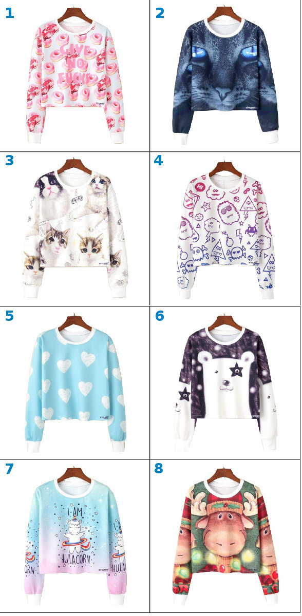This amazing collection of harajuku sweaters comes in 8 colors and styles. Select your choice.