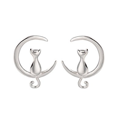 Girls/Womens Sterling Silver Cat On The Half Moon Fashion Trendy Earrings