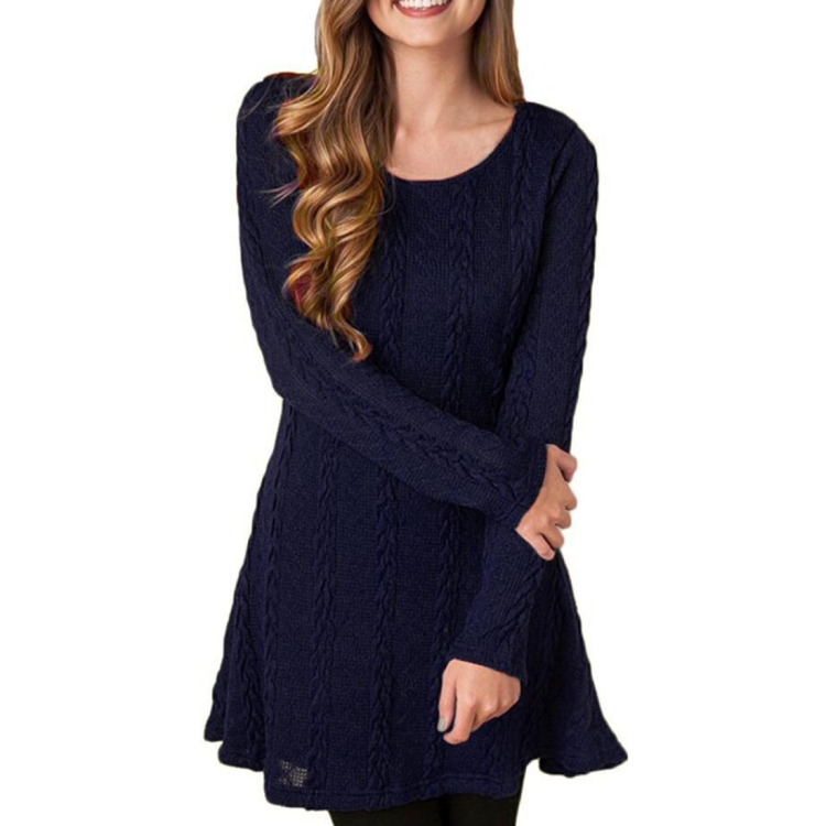 Womens Round Neck Long Sleeve Knitted Short Dress Dark Blue