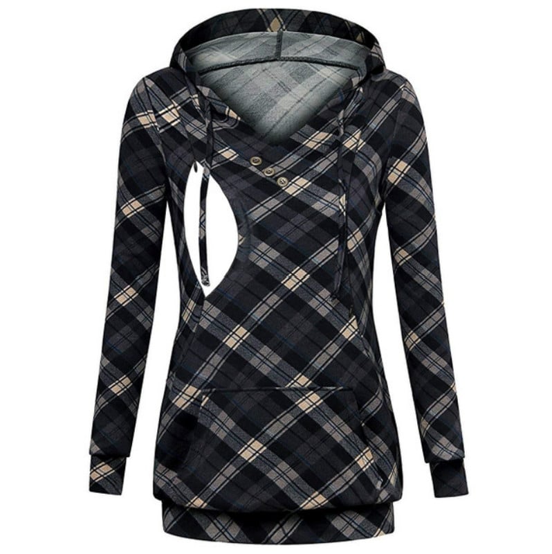 Stylish Maternity Breast Feeding Hooded Plaid Stripe Long Sleeve Sweater Grey