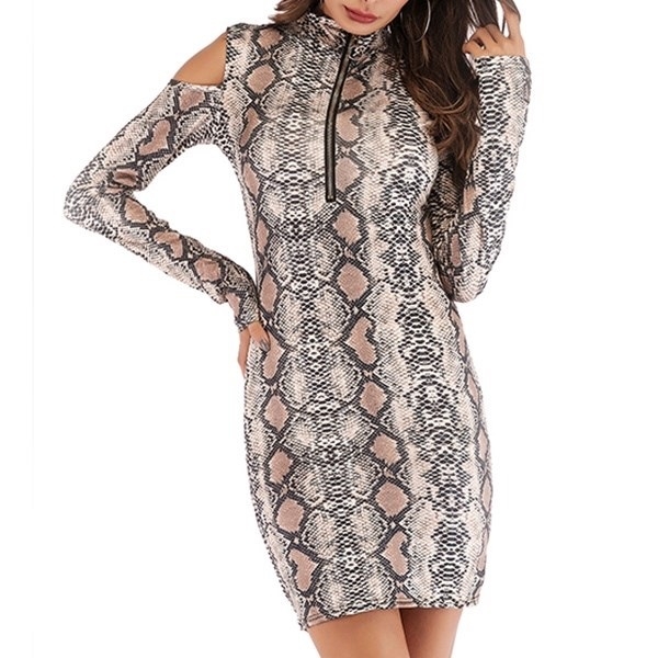 Womens Fashion Trendy Snake Print Slim Fit Long Sleeve Open Shoulder Short Dress