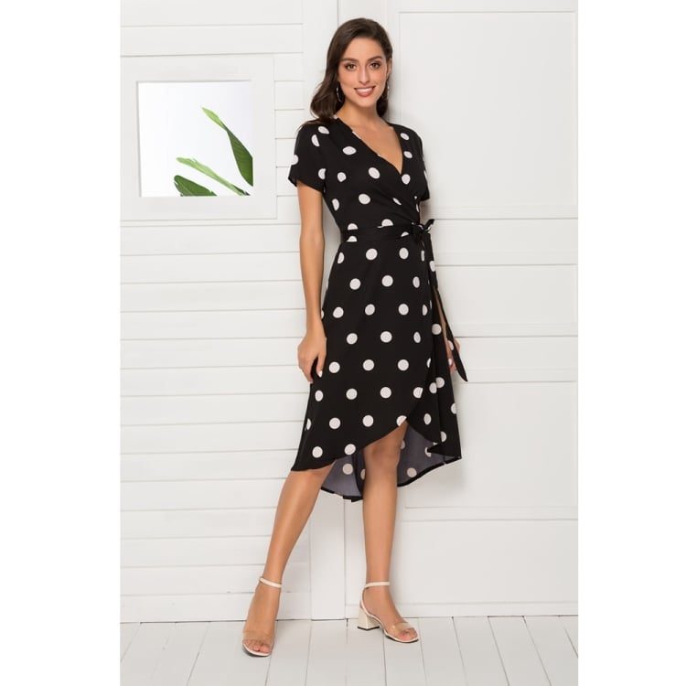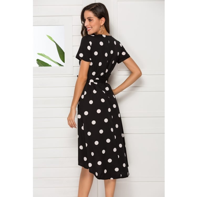 Womens Fashion Trendy Black & White Polka Dot V-Neck Slim Fit Short Sleeve Dress