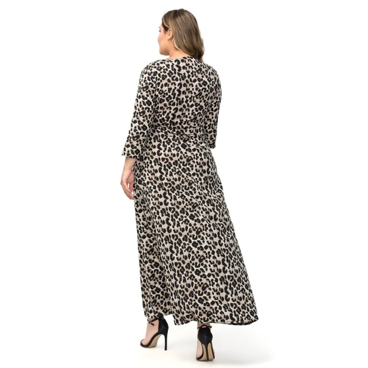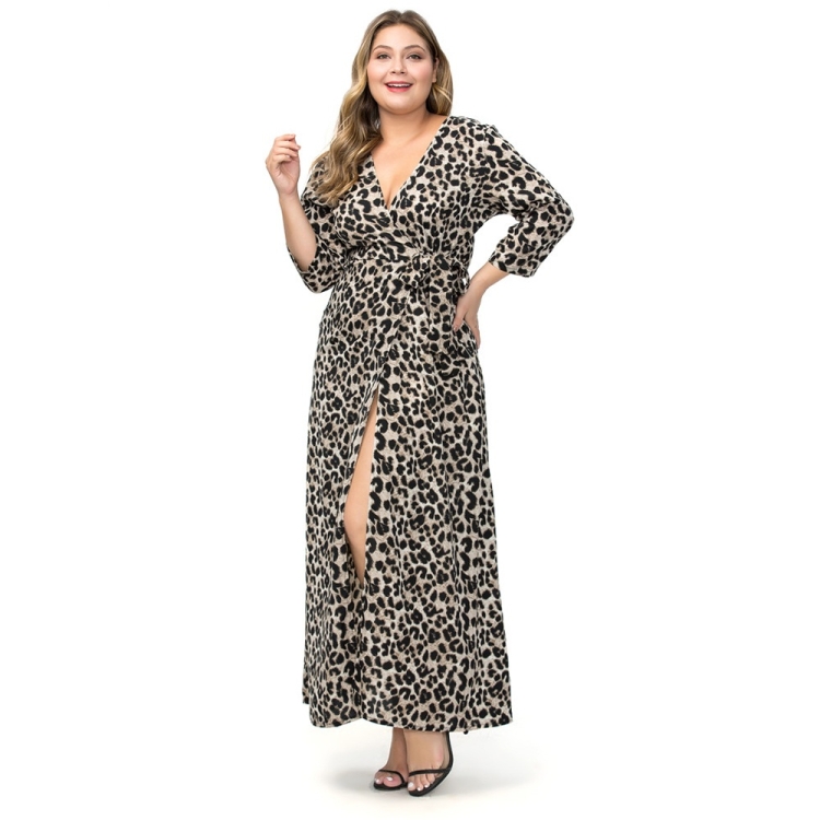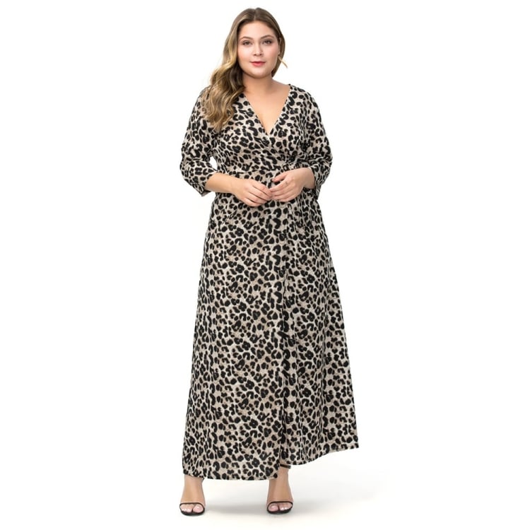 Plus Size Womens Fashion Trendy Leopard Print V-Neck Long Sleeve Dress